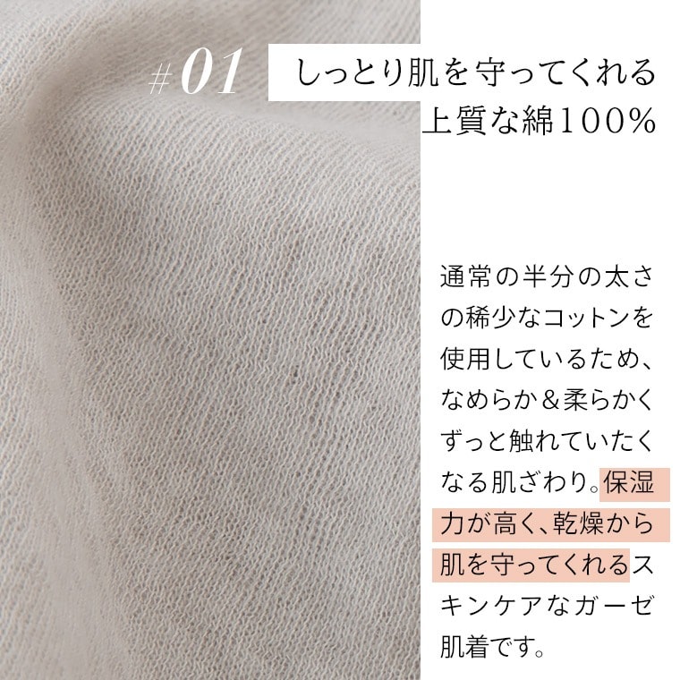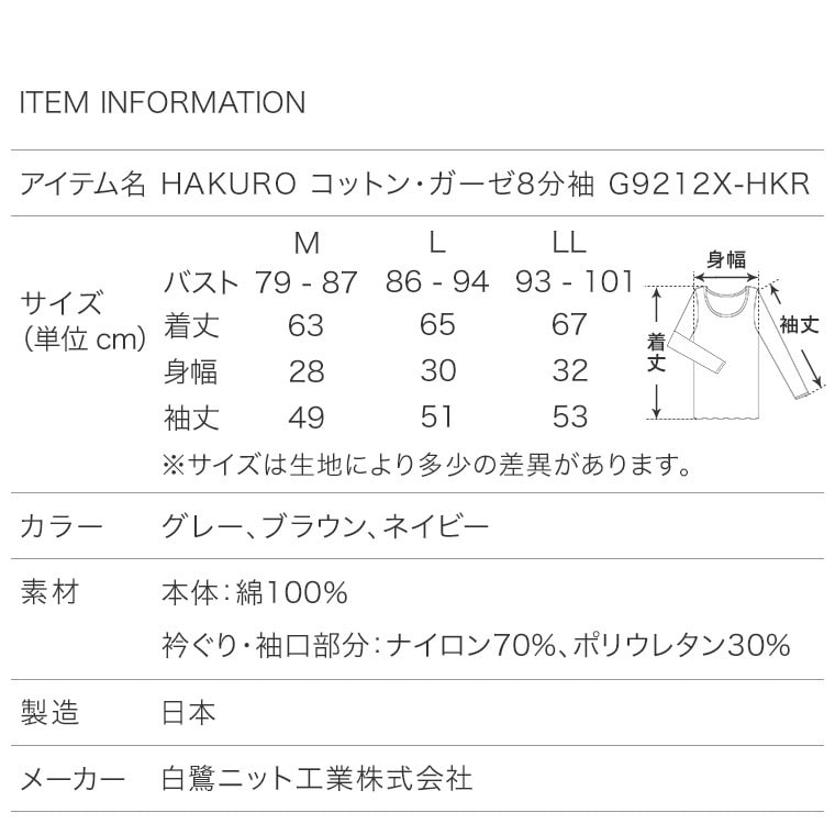 【スペック】 アイテム名: HAKURO コットン・ガーゼ8分袖 G9212X-HKR サイズ: M / L / LL バスト:79-87 / 86-94 / 93-101 着丈:63 / 65 / 67 身幅: 28 / 30 / 32 袖丈:49 / 51 / 53 ※サイズは生地により多少の差異があります。 素材:(本体)綿100% (衿ぐり・袖部分)ナイロン70%ポリウレタン30% 製造:日本 綿100% 8分袖 コットン ガーゼ HAKURO レディース 年間 インナー シャツ 肌に優しい 敏感肌 乾燥肌 バレエネック 通気性 長袖 薄手 30代 40代 50代 60代 春 夏 秋 肌着 下着 日本製 グレー/ブラウン/ネイビー M/L/LL G9212X-HKR