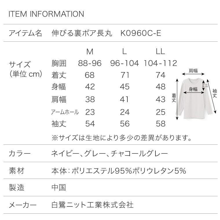 【スペック】 アイテム名:伸びる裏ボア長袖丸首 K0960C-E サイズ M / L / LL ウエスト:76-84 / 84-94 / 94-104 着丈:68 / 71 / 74 身幅:42 / 45 / 48 肩幅:38 / 41 / 43 アームホール:23 / 24 / 25 袖丈:54 / 56 / 58 ※サイズは生地により多少の差異があります。 素材:本体:ポリエステル95%、ポリウレタン5% 製造:中国 のびる 裏ボア 起毛 長袖 ストレッチ インナー メンズ 秋冬 冷え 対策 長袖 厚手 ストレッチ性 スポーツ 暖かい あたたかい あったか 防寒 保温 丸首 ルームウェア 部屋着 紳士 下着 肌着 重ね着 ネイビー/グレー/チャコールグレー M/L/LL K0960C-E