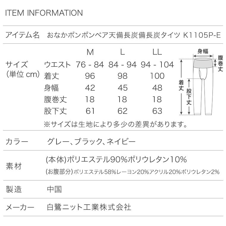 【スペック】 アイテム名:おなかポンポン ベア天備長炭備長炭タイツ K1105P-E サイズ: M / L / LL ウエスト:76 - 84 / 84-94 / 94-104 着丈:96 / 98 / 100 身幅:42 / 45 / 48 腹巻丈:18 / 18 / 18 肩幅:41 / 44 / 47 股下丈:61 / 62 / 63 ※サイズは生地により多少の差異があります。 素材:(本体)ポリエステル90%ポリウレタン10% お腹部分:ポリエステル58%レーヨン20%ポリウレタン2% 製造:中国 腹巻付きインナー 備長炭繊維入り ズボン下 スパッツ タイツ 前あき 前開き 裏起毛 メンズ 秋冬 インナー はらまき 暖かい保温 防寒 ストレッチ 男性 紳士 下着 肌着 24AW グレー/ブラック/ネイビー M/L/LL K1105P-E