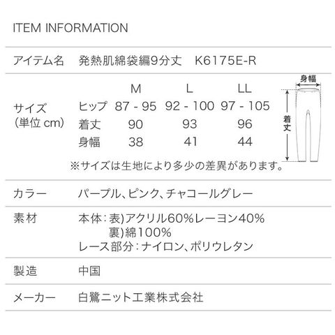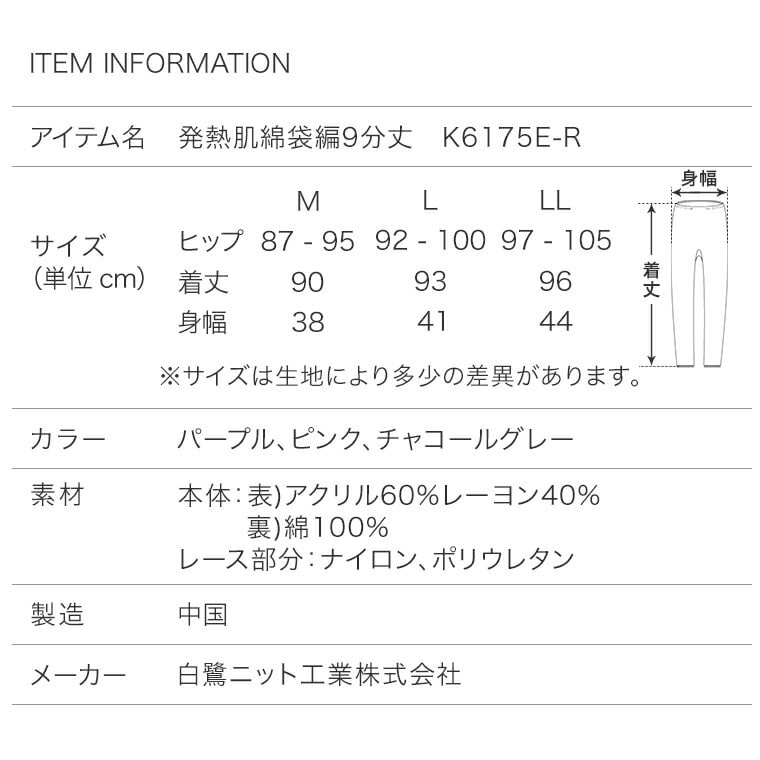 レディース インナー 肌側 綿100% 発熱 9分丈 レギンス ボトムス 秋冬 発熱機能 袋編み あったか スパッツ 暖かい 下着 肌着 婦人 女性 パープル/ピンク/チャコールグレー M/L/LL K6175E-R 防寒