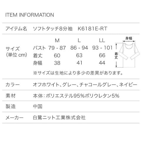 【スペック】 アイテム名:ソフトタッチ8分袖 K6181E-RT サイズ M / L / LL 胸囲:79-87 / 86-94 / 93-101 着丈:60 / 63 / 66 身幅:38 / 41 / 44 ※サイズは生地により多少の差異があります。 素材:ポリエステル95%、ポリウレタン5% 製造:中国 ふんわり 軽くて あたたかい 8分袖 レディース 秋冬 半袖 暖かい あたたかい 保温 表起毛 無地 シンプル ストレッチ 冬用 女性 婦人 下着 肌着 オフホワイト/グレー/チャコールグレー/ネイビー M/L/LL K6181E-RT