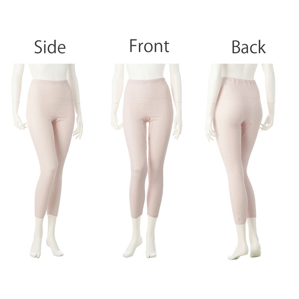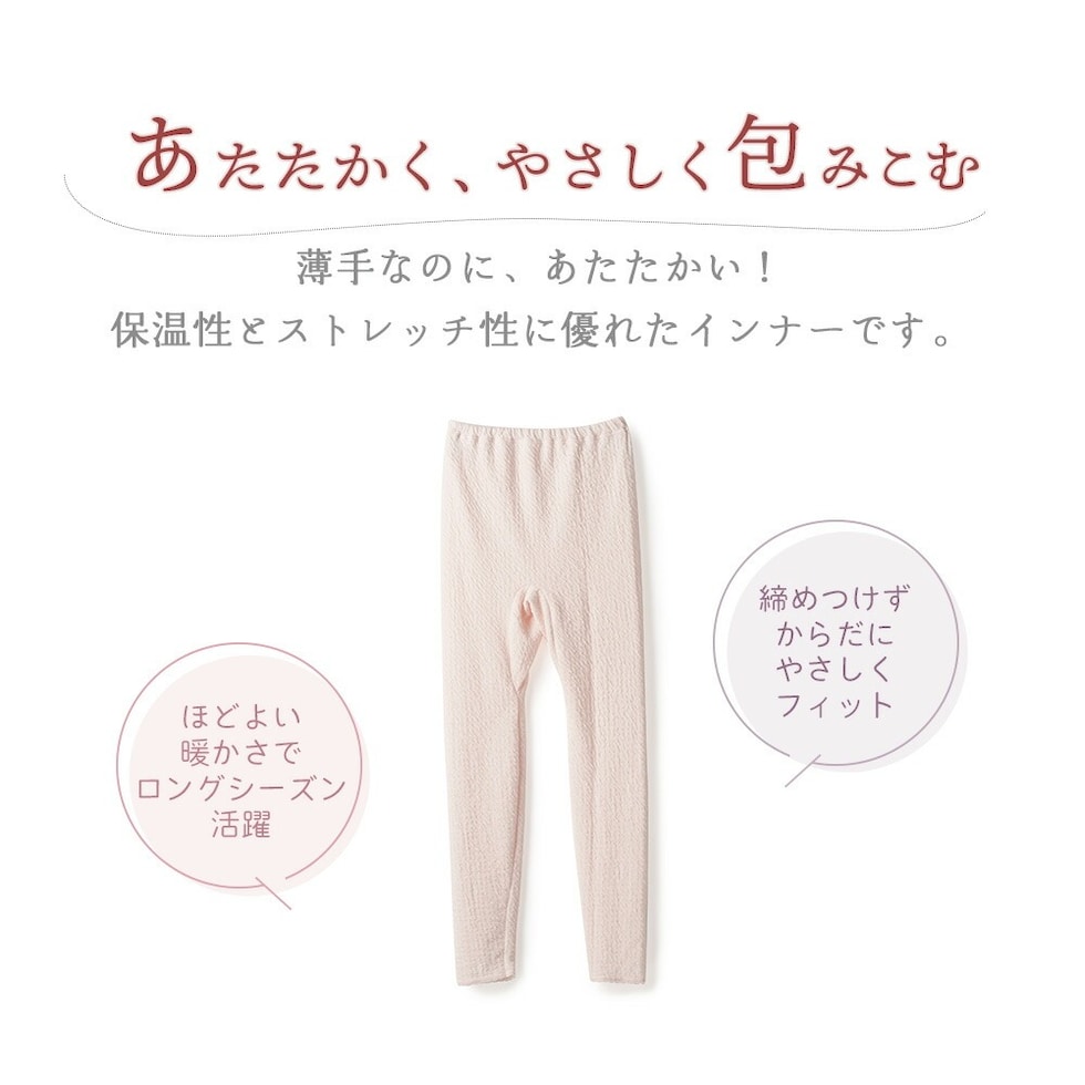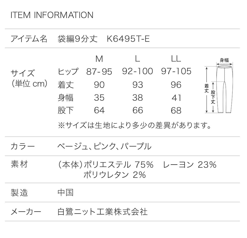 【スペック】 アイテム名:袋編9分丈 K6495T-E サイズ M / L / LL 胸囲:87-95 / 92-100 / 97-105 着丈:90 / 93 / 96 身幅:35 / 38 / 41 股下丈:64 / 66 / 68 ※サイズは生地により多少の差異があります。 素材:ポリエステル 75% レーヨン 23% ポリウレタン 2% 製造:中国 あったか インナー 保温 9分丈 レギンス レディース 秋冬 防寒 暖かい あたたかい 無地 レース ふんわり 薄手 ストレッチ 冬用 ボトムス 女性 婦人 下着 肌着 スパッツ ベージュ/ピンク/パープル M/L/LL K6495T-E