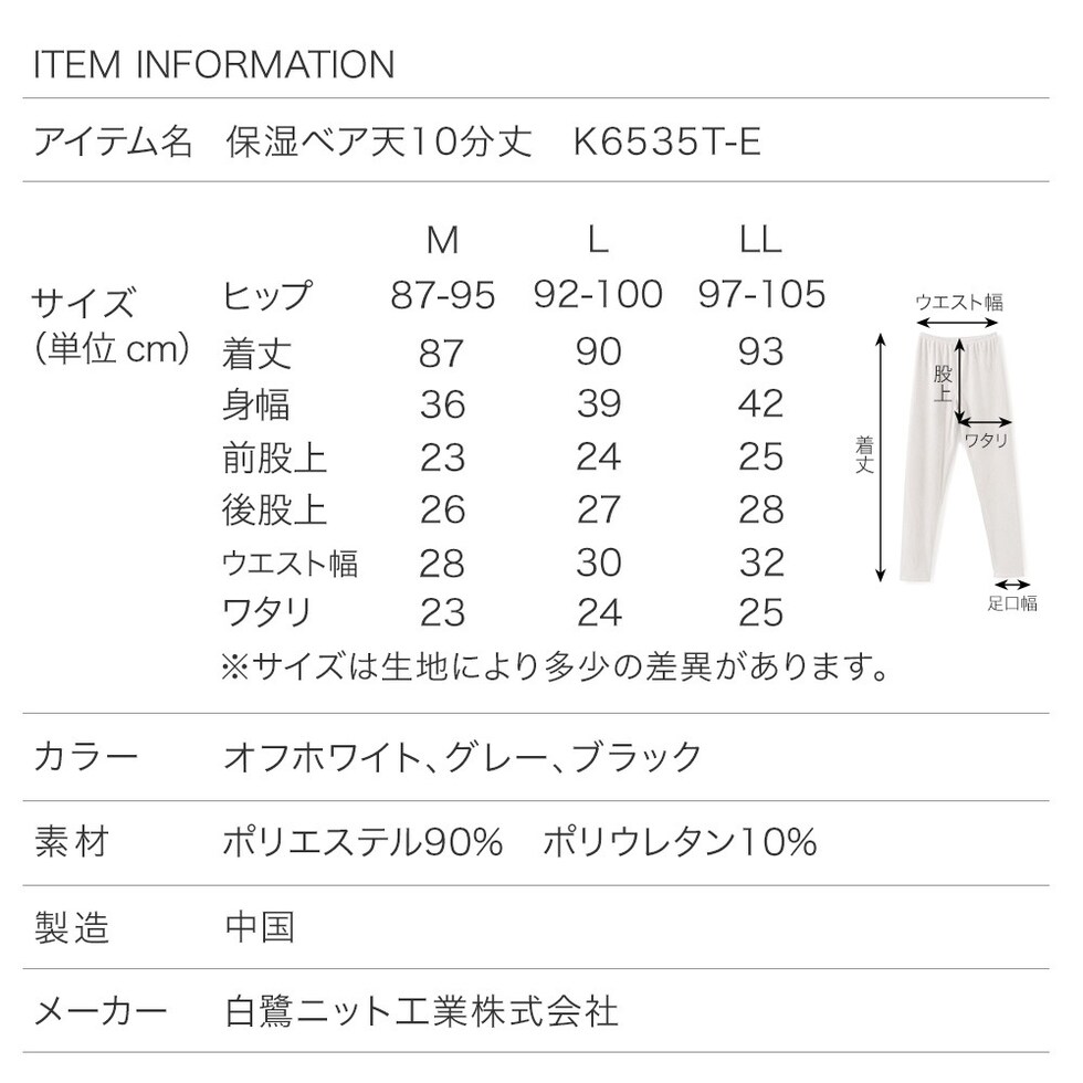 【スペック】 アイテム名:保湿ベア天10分丈 K6535T-E サイズ: M / L / LL ウエスト:87-95 / 92-100 / 97-105 着丈:87 / 90 / 93 身幅:36 / 39 / 42 前股上;23 / 24 / 25 後股上:26 / 27 / 28 ウエスト幅:28 / 30 / 32 ワタリ:23 / 24 / 25 ※サイズは生地により多少の差異があります。 素材:(本体)ポリエステル90%ポリウレタン10% 製造:中国 アルガンオイル加工 保湿 8分袖 表起毛 秋冬 インナー 暖かい 保温 ストレッチ 女性 婦人 下着 肌着 24AW オフホワイト / グレー/ ブラック M/L/LL K6531T-E