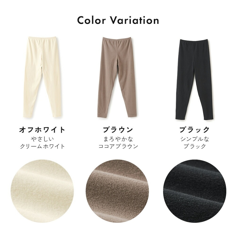 【スペック】 アイテム名:ベアフライス両起毛9分丈 K6595P-E サイズ M / L / LL ヒップ:89-95 / 92-100 / 97-105 着丈:86 / 89 / 92 身幅:35 / 38 / 41 前股上:25 / 26 / 27 後股上:28 / 29 / 30 袖丈:52 / 54 / 56 ウエスト幅:28 / 30 / 32 ワタリ:24 / 25 / 26 ※サイズは生地により多少の差異があります。 素材:本体:ポリエステル95%、ポリウレタン5% 製造:中国 極上 ふんわりタッチ 両起毛 保湿 ストレッチ ふんわり感 9分丈 ボトム インナー 秋冬 レディース お肌に優しい 婦人 女性 下着 肌着 24AW オフホワイト/ブラウン/ブラック M/L/LL K6595P-E