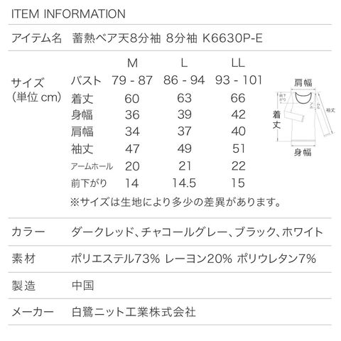 【スペック】 アイテム名:HEAT&STRETCH Premium 蓄熱ベア天8分袖 K6630P-E サイズ: M / L / LL バスト:79-87 / 86-94 / 93-101 着丈:60 / 63 / 66 身幅:36 / 39 / 42 肩幅;34 / 37 / 40 袖丈:47 / 49 / 51 アームホール:20 / 21 / 22 前下がり:14 / 14.5 / 15 ※サイズは生地により多少の差異があります。 素材:(本体) ポリエステル73% レーヨン20% ポリウレタン7% 製造:中国 蓄熱 機能インナー 静電防止 蓄熱保温 ストレッチ +6.2℃ 暖か 薄い 裏起毛 動きやすい パチパチ軽減 8分袖 インナー 秋冬 レディース 婦人 女性 下着 肌着 24AW ダークレッド/チャコールグレー/ブラック/ホワイト M/L/LL K6630P-E
