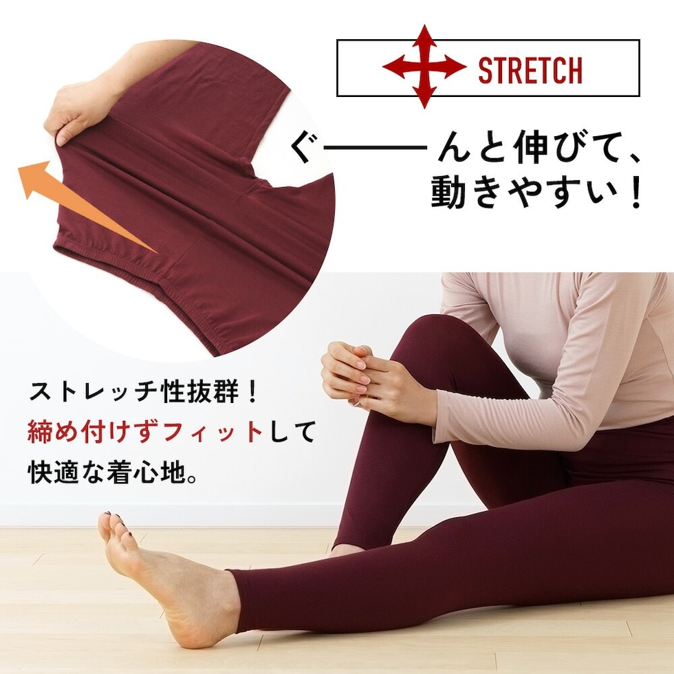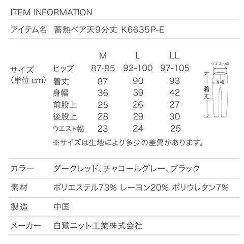 【スペック】 アイテム名:HEAT&STRETCH Premium 蓄熱ベア天9分丈. K6635P-E サイズ: M / L / LL ヒップ:87-95 / 92-100 / 97-105 着丈:87 / 90 / 93 身幅:36 / 39 / 42 前股上;25 / 26 / 27 後股上:28 / 29 / 30 ウエスト幅:23 / 24 / 25 ※サイズは生地により多少の差異があります。 素材:(本体) ポリエステル73% レーヨン20% ポリウレタン7% 製造:中国 蓄熱 機能インナー 静電防止 蓄熱加工 保湿効果 保湿 ストレッチ 裏起毛 動きやすい 9分丈 ボトム インナー 秋冬 レディース お肌に優しい 婦人 女性 下着 肌着 24AW ダークレッド/チャコールグレー/ブラック M/L/LL K6635P-E