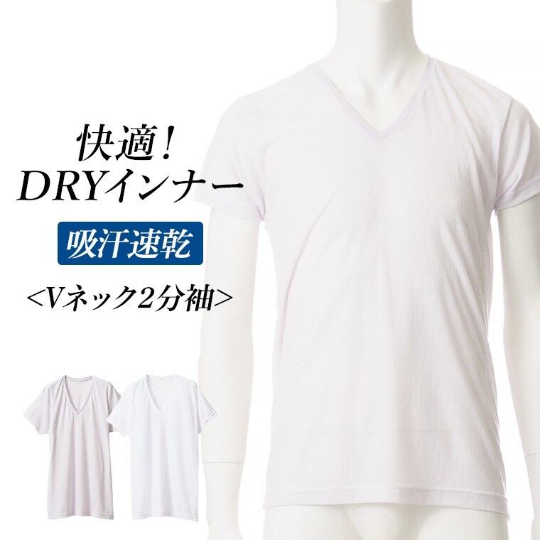 メンズ インナー 半袖 快適 DRY 2分袖 春夏 トップス ドライ 吸汗速乾 V首 Vネック 男性 肌着 紳士 下着 ホワイト/グレー M/L/LL L0280E-E 涼しい