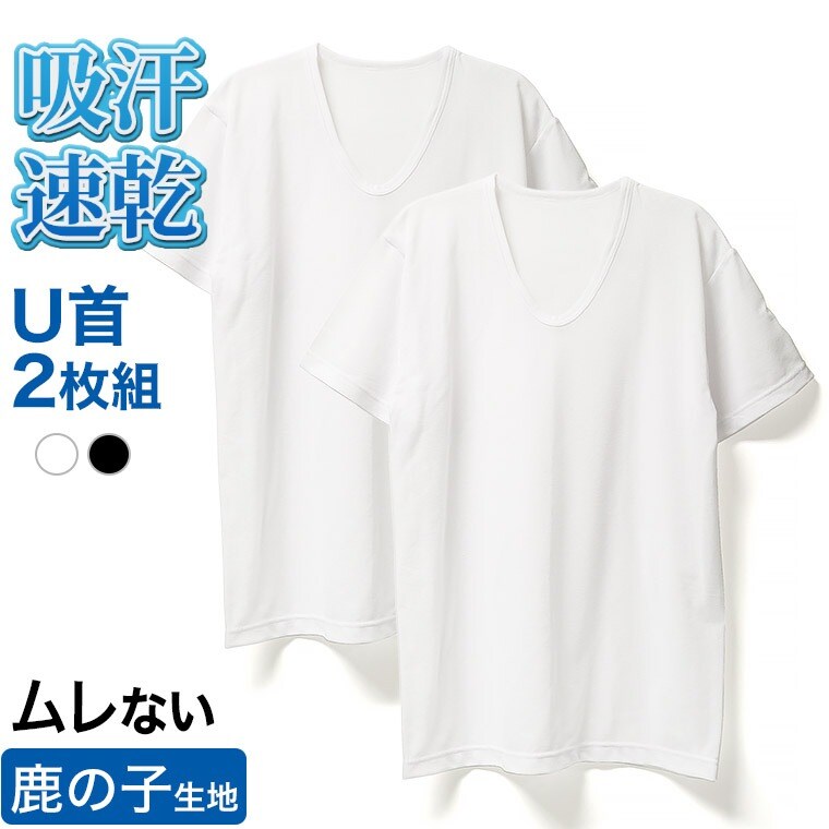メンズ インナー 半袖 鹿の子 U首 Tシャツ 2枚 セット 春夏 肌着 下着 消臭 吸汗 速乾 紳士 男性 綿混 Uネック 父の日 new ホワイト/ブラック M/L/LL L0602E-E 涼しい