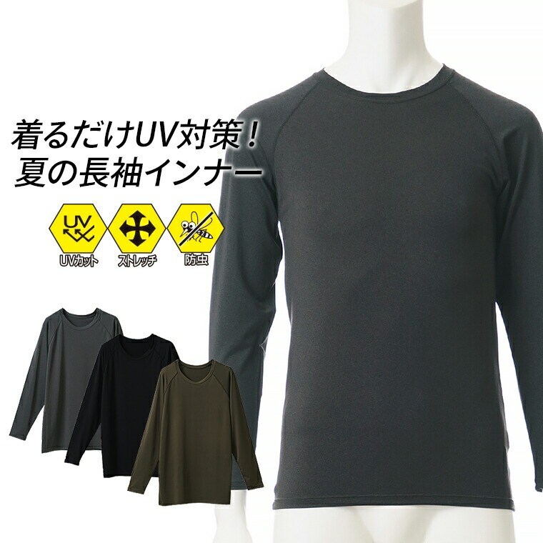 メンズ インナー 長袖 丸首 ラグラン 春夏 防虫 UVカット 通気性 ストレッチ アンダーウェア 男性 紳士 カジュアル スポーツ キャンプ アウトドア new チャコールグレー/ダークグリーン/ブラック M/L/LL L1010T-E 涼しい 肌着