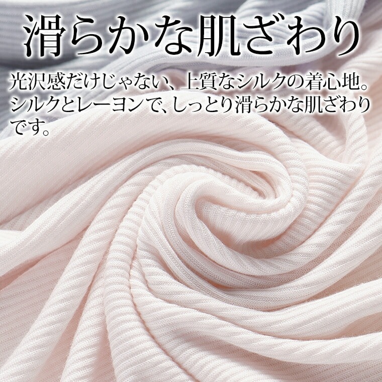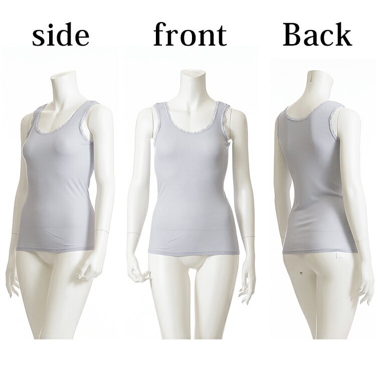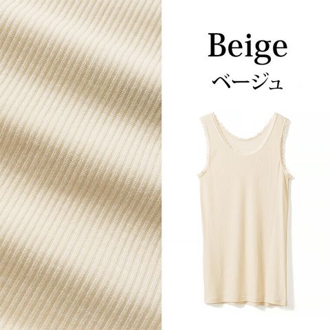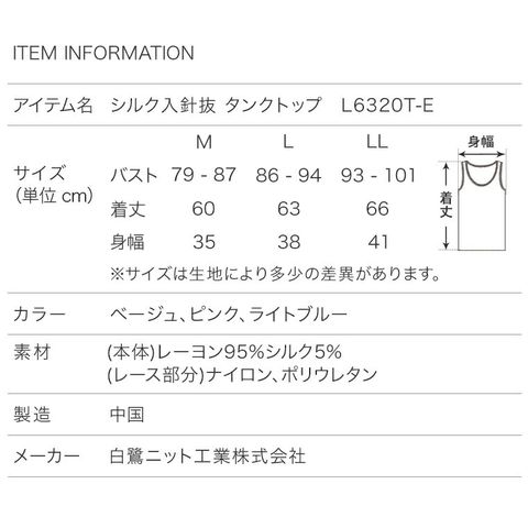【スペック】 アイテム名:シルク入針抜タンクトップ L6320T-E サイズ: M / L / LL バスト:79-87 / 86-94 / 93-101 着丈:60 / 63 / 66 身幅:35 / 38 / 41 ※サイズは生地により多少の差異があります。 素材:(本体) レーヨン95%シルク5% (レース部分)ナイロン、ポリウレタン 製造:中国 シルク入り インナーシャツ タンクトップ レディース 春夏 レース付き タンク ノースリーブ サラサラ 肌ざわり なめらか ベージュ/ピンク/ライトブルー M/L/LL L6320T-E