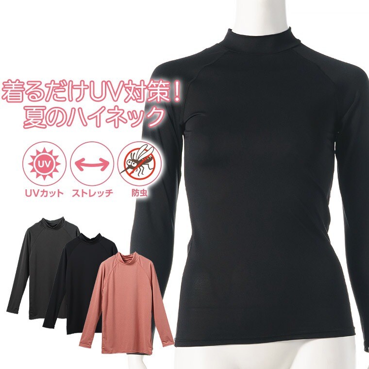 レディース インナー 長袖 ハイネック ラグラン 春夏 UVカット アウトドア 通気性 アンダーウェア ストレッチ カジュアル スポーツ キャンプ 防虫 女性 婦人 下着 肌着 new ピンク/チャコールグレー/ブラック M/L/LL L6341T-E 涼しい