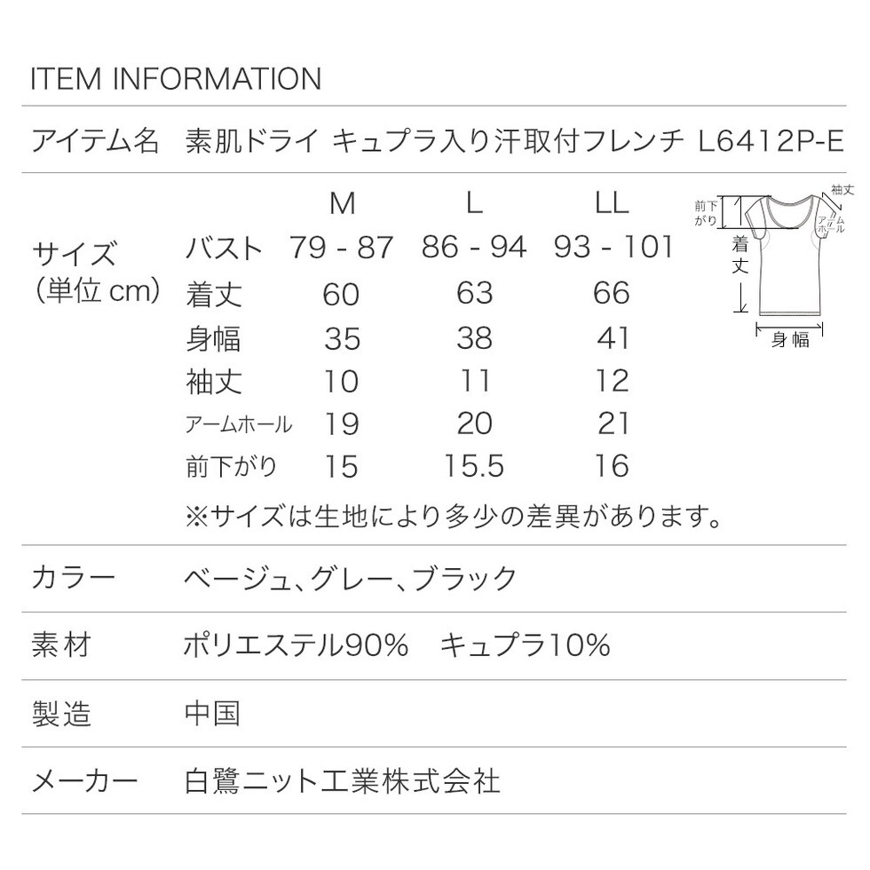 【スペック】 アイテム名: 素肌ドライ キュプラ入り汗取付フレンチ L6412P-E サイズ:M / L / LL バスト:79-87 / 86-94 / 93-101 着丈: 58 / 61 / 64 身幅: 35 / 38 / 41 ※サイズは生地により多少の差異があります。 素材:(本体) ポリエステル90% キュプラ10% 製造:中国 汗取り インナー キュプラ入り フレンチ袖 脇汗 インナー 汗取り パッド付き 素肌ドライ レディース 春夏 汗染み 防止 汗 対策 シャツ 綿 汗とり パット付き 吸汗速乾 大汗 20代 30代 40代 50代 ベージュ/ブラック/グレー M/L/LL L6412P-E