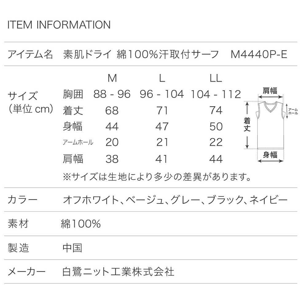 【スペック】 アイテム名:素肌ドライ 綿100%汗取付サーフ M4440P-E サイズ: M / L / LL 胸囲: 88-96 / 96-104 / 104-112 着丈: 68 / 71 / 74 身幅: 44 / 47 / 50 ※サイズは生地により多少の差異があります。 素材:(本体) 綿100% 製造:中国 素肌ドライ 綿100% 汗取り インナー サーフ V首 メンズ 春夏 脇汗 シャツ パッド付き ドライ 汗染み 防止 汗 対策 シャツ 綿混 汗とり パット付き 吸汗速乾 肌着 紳士 男性 ホワイト/グレー/ベージュ/ブラック/ネイビー M/L/LL M4440P-E