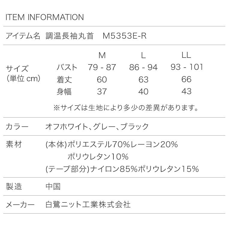 【スペック】 アイテム名: 調温キャミソール M5353E-R サイズ: M / L / LL バスト:79-87 / 86-94 / 93-101 着丈:60 / 63 / 66 身幅:37 / 40 / 43 ※サイズは生地により多少の差異があります。 素材:(本体) ポリエステル70%レーヨン20%ポリウレタン10% (テープ部分)ナイロン85%ポリウレタン15% 製造:中国 温度調整 インナー ムレ軽減 レディース 春夏 調温 長袖 オフ 女性 婦人 下着 吸放湿性 しっとりなめらか オフホワイト/グレー/ブラック M/L/LL M5353E-R