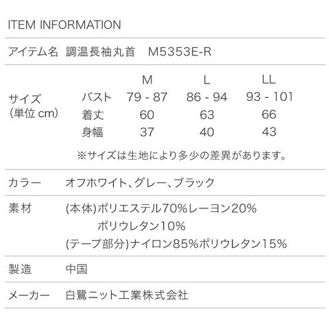 【スペック】 アイテム名: 調温キャミソール M5353E-R サイズ: M / L / LL バスト:79-87 / 86-94 / 93-101 着丈:60 / 63 / 66 身幅:37 / 40 / 43 ※サイズは生地により多少の差異があります。 素材:(本体) ポリエステル70%レーヨン20%ポリウレタン10% (テープ部分)ナイロン85%ポリウレタン15% 製造:中国 温度調整 インナー ムレ軽減 レディース 春夏 調温 長袖 オフ 女性 婦人 下着 吸放湿性 しっとりなめらか オフホワイト/グレー/ブラック M/L/LL M5353E-R