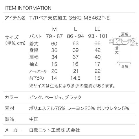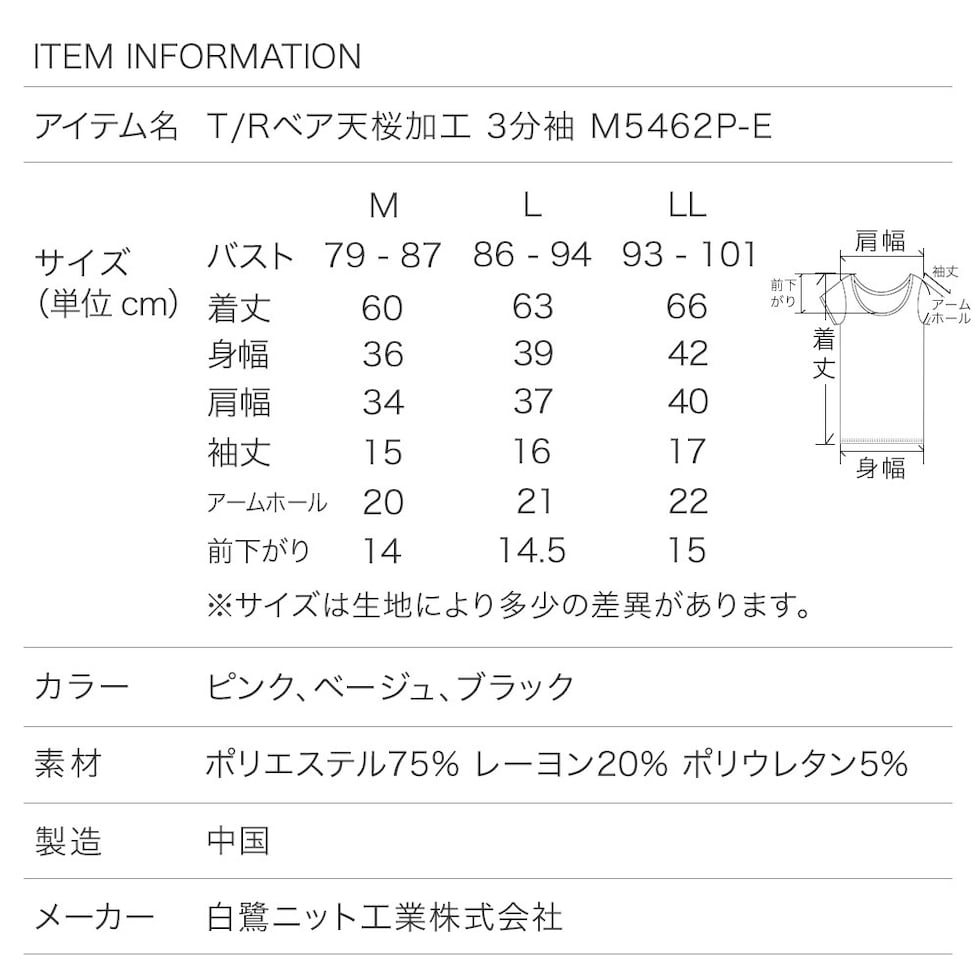 【スペック】 アイテム名:T/Rベア天桜加工 3分袖 M5462P-E サイズ: M / L / LL バスト:79-87 / 86-94 / 93-101 着丈:60 / 63 / 66 身幅:35 / 38 / 41 ※サイズは生地により多少の差異があります。 素材:(本体) ポリエステル75% レーヨン20% ポリウレタン5% 製造:中国 桜加工 保湿インナー しっとり感 保湿効果 ストレッチ 抗菌防臭 動きやすい 3分袖 インナー 春夏 レディース お肌に優しい 婦人 女性 下着 肌着 ベージュ/ピンク/ブラック M/L/LL M5462P-E