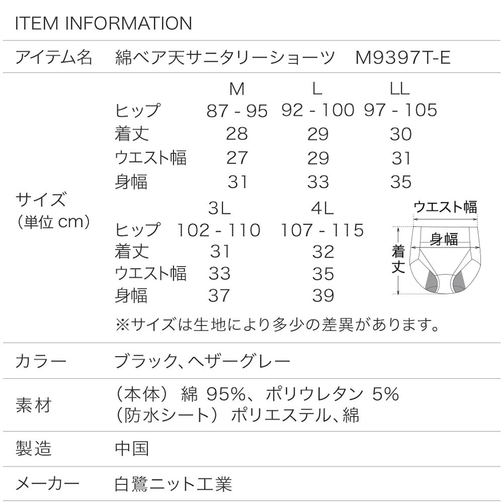 【スペック】 アイテム名: 綿ベア天サニタリーショーツ M9397T-E サイズ: M / L / LL / 3L / 4L ヒップ: 87-95 / 92-100 / 97-105 / 102-110 / 107-115 着丈: 28 / 29 / 30 / 31 / 32 身幅: 31 / 33 / 35 / 37 / 39 ※サイズは生地により多少の差異があります。 素材:(本体) 綿95%ポリウレタン5% (防水シート)ポリエステル、綿 製造:中国 サニタリー ショーツ 綿 羽つき 対応 昼用 夜用 お肌に優しい ヒップアップ レディース 年間 ブラック/グレー M/L/LL/3L/4L M9397T-E