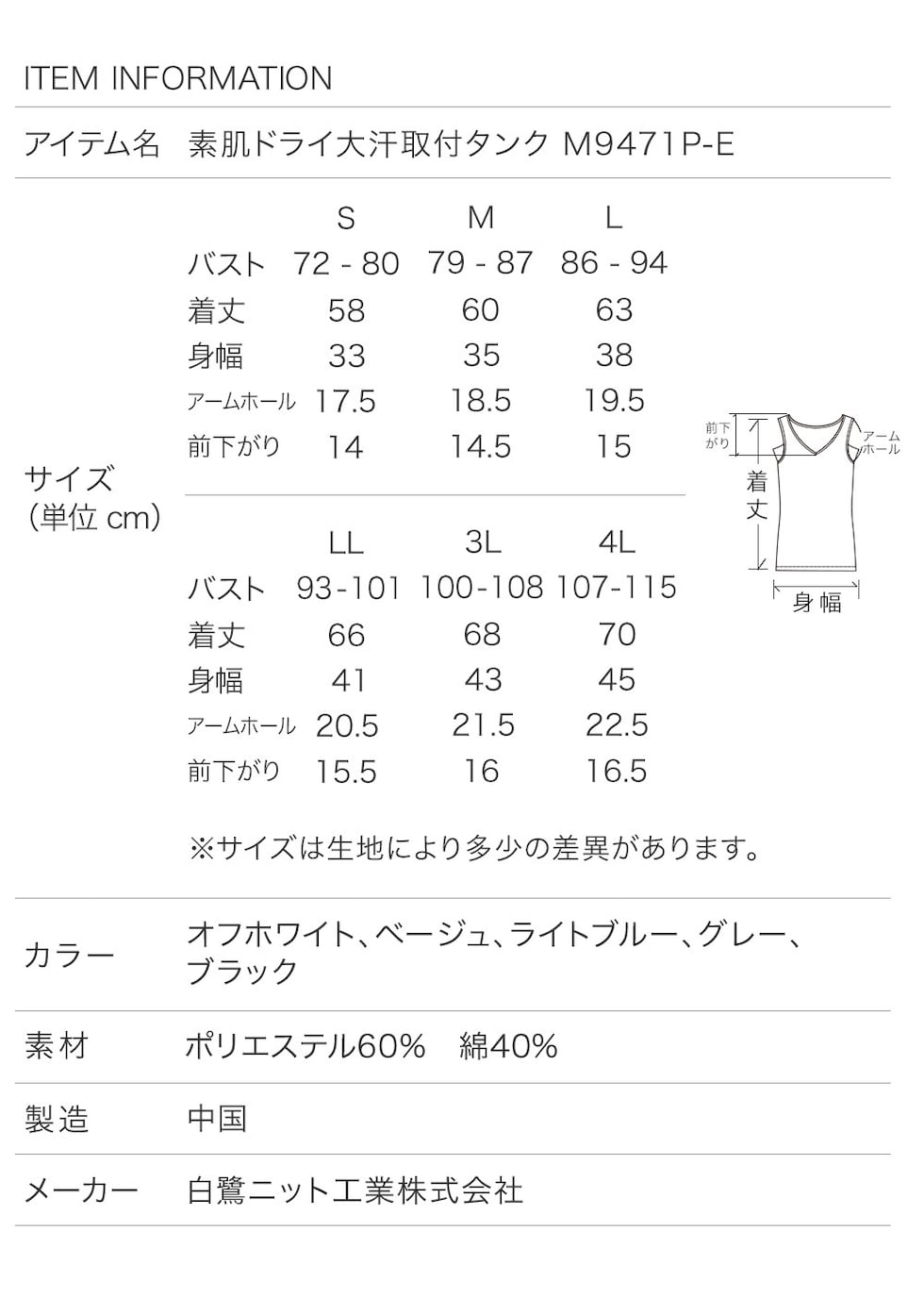【スペック】 アイテム名:素肌ドライ 大汗取付タンク. M9471P-E サイズ:S / M / L / LL / 3L / 4L バスト:72-80 / 79-87 / 86-94 / 93-101 /100-108 / 107-115 着丈: 58 / 60 / 63 / 66 / 68 / 70 身幅: 33 / 35 / 38 / 41 / 43 / 45 ※サイズは生地により多少の差異があります。 素材:(本体) ポリエステル60% 綿40% 製造:中国 大汗取り インナー タンクトップ 脇汗 インナー 汗取り パッド付き 素肌ドライ レディース 春夏 汗染み 防止 汗 対策 シャツ 綿 汗とり パット付き 吸汗速乾 大汗 20代 30代 40代 50代 オフホワイト/ベージュ/ブラック/グレー/ライトブルー/ M/L/LL M9471P-E