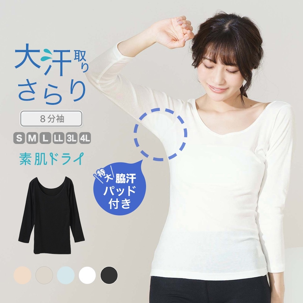 レディース インナー シャツ 長袖 素肌ドライ 大汗取り 脇汗 8分袖 パッド付き 春夏 汗染み 防止 汗 対策 綿混 汗とり パット付き 吸汗速乾 24SS オフホワイト/ベージュ/ブラック/グレー M/L/LL M9473P-E 涼しい 肌着
