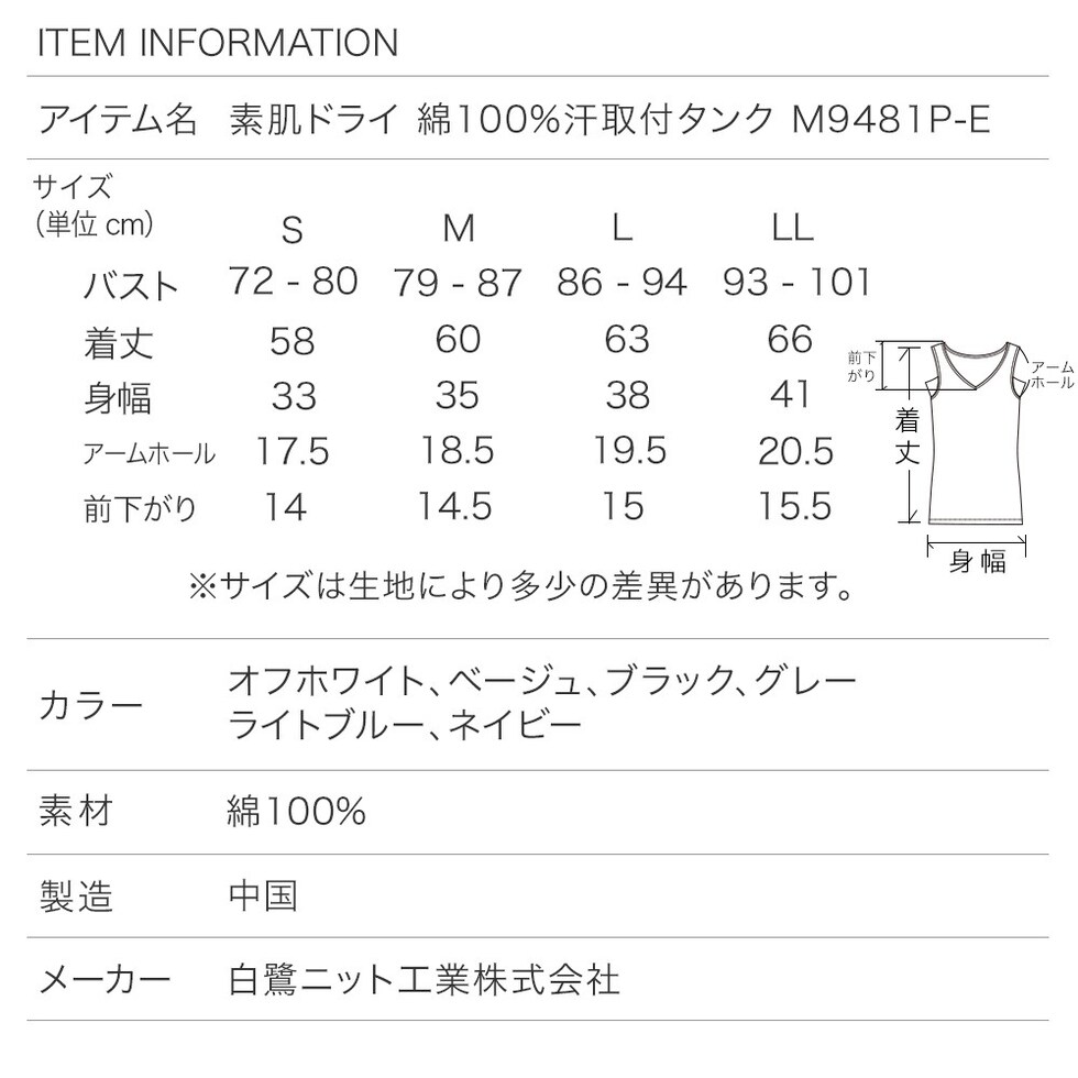 【スペック】 アイテム名: 素肌ドライ 綿100%汗取付タンク M9481P-E サイズ: S / M / L / LL バスト: 72-80 / 79-87 / 86-94 / 93-101 着丈: 58 / 60 / 63 / 66 身幅: 33 / 35 / 38 / 41 ※サイズは生地により多少の差異があります。 素材:(本体) 綿100% 製造:中国 汗取り インナー 綿100% タンクトップ 脇汗 インナー 汗取り パッド付き 素肌ドライ レディース 春夏 汗染み 防止 汗 対策 ノースリーブ シャツ 綿混 汗とり パット付き 吸汗速乾 大汗 オフホワイト/ベージュ/ブラック/グレー/ライトブルー/ネイビー S/M/L/LL M9481P-E