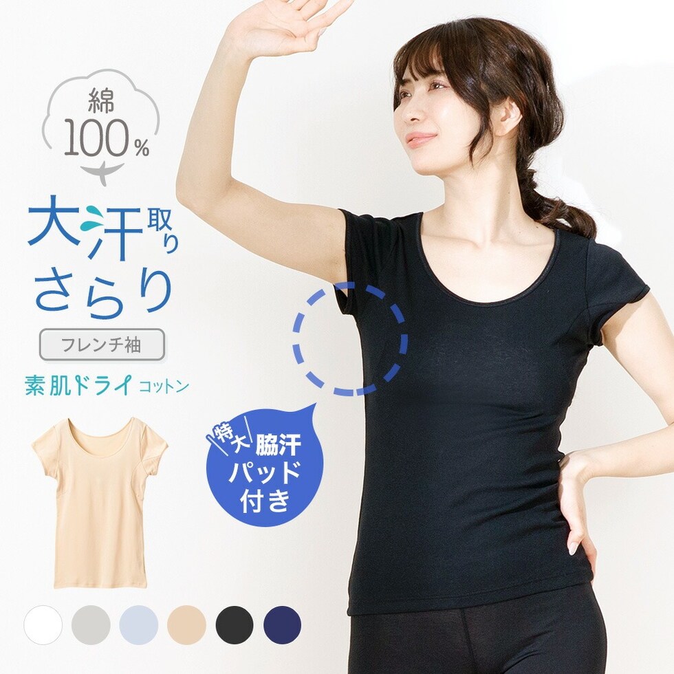 レディース インナー 半袖 2枚組 素肌ドライ 綿100% 大汗取り フレンチ袖 セットでお得!! 脇汗 フレンチ袖 汗取り パッド付き 春夏 汗染み 防止 汗 防災 対策 綿 汗とり パット付き 吸汗速乾 M9492P-E 涼しい 肌着