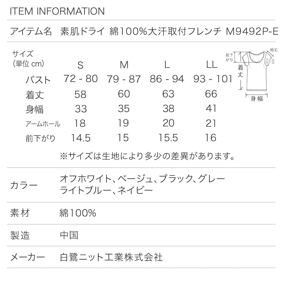 【スペック】 アイテム名:素肌ドライ 綿100%大汗取付8分袖 M9493P-E サイズ: S / M / L / LL バスト: 72-80 / 79-87 / 86-94 / 93-101 着丈: 58 / 60 / 63 / 66 身幅: 33 / 35 / 38 / 41 ※サイズは生地により多少の差異があります。 素材:(本体) 綿100% 製造:中国 汗取り インナー 8分袖 脇汗 インナー 汗取り パッド付き 素肌ドライ レディース 春夏 汗染み 防止 汗 対策 半袖 シャツ 綿混 汗とり パット付き 吸汗速乾 大汗 オフホワイト/ベージュ/ブラック/グレー/ネイビー/サックス S/M/L/LL M9493P-E