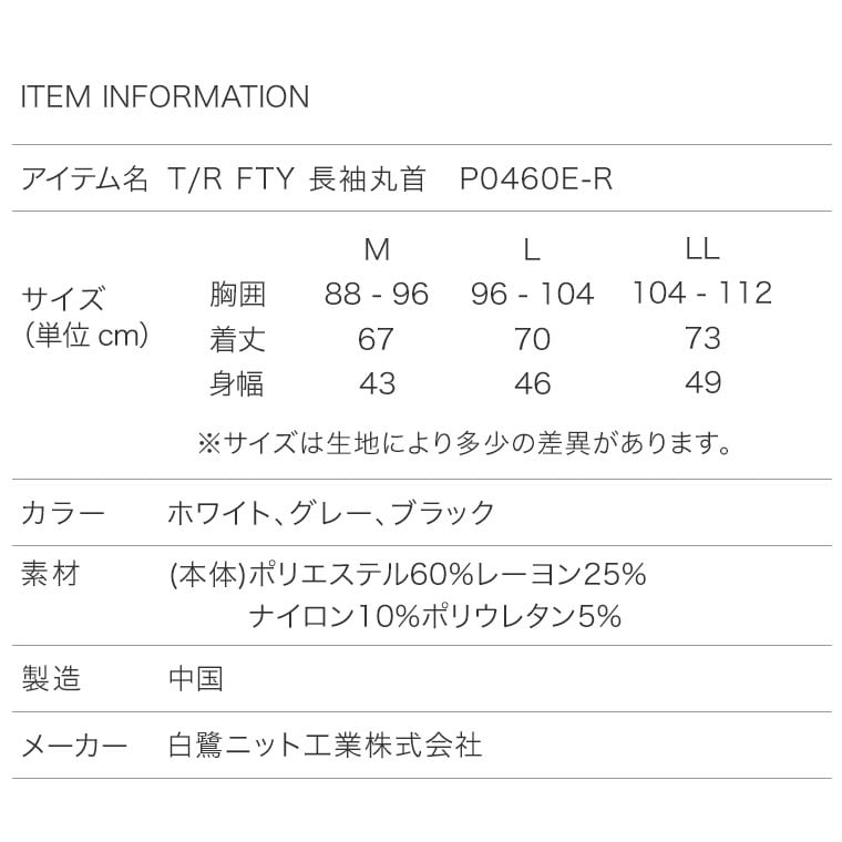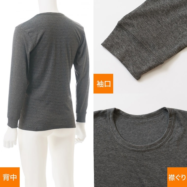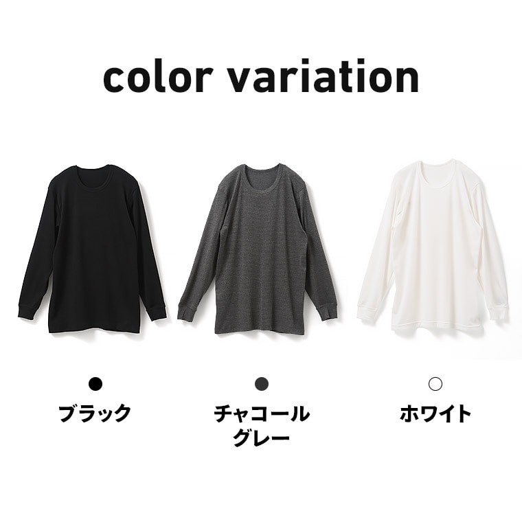 【スペック】 アイテム名:T/R FTY 長袖丸首 P0460E-R サイズ M / L / LL 胸囲:88-96 / 96-104 / 104-112 着丈:67 / 70 / 73 身幅:43 / 46 / 49 ※サイズは生地により多少の差異があります。 素材:(本体) ポリエステル60%、レーヨン25% ナイロン10%、ポリウレタン5% 製造:中国 発熱 長袖 丸首 インナー シャツ メンズ 秋冬 吸湿 防寒 暖かい あったか あたたかい 薄い ストレッチ アンダーシャツ アンダーウェア 男性 紳士 下着 肌着 HEAT&STRETCH ヒートテック グレー/ブラック/オフホワイト M/L/LL P0460E-R