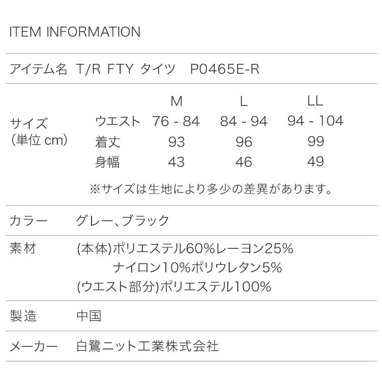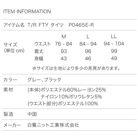 【スペック】 アイテム名:T/R FTY タイツ P0465E-R サイズ M / L / LL 胸囲:76-84 / 84-94 / 94-104 着丈:93 / 96 / 99 身幅:43 / 46 / 49 ※サイズは生地により多少の差異があります。 素材:(本体) ポリエステル60%、レーヨン25% ナイロン10%、ポリウレタン5% (ウエスト部分)ポリエステル100% 製造:中国 発熱 ロング タイツ メンズ 秋冬 吸湿 ズボン下 スパッツ パンツ 防寒 暖かい あったか あたたかい 薄い ストレッチ アンダーウェア 男性 紳士 下着 肌着 HEAT&STRETCH グレー/ブラック M/L/LL P0465E-R