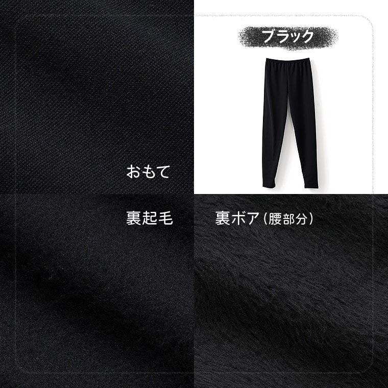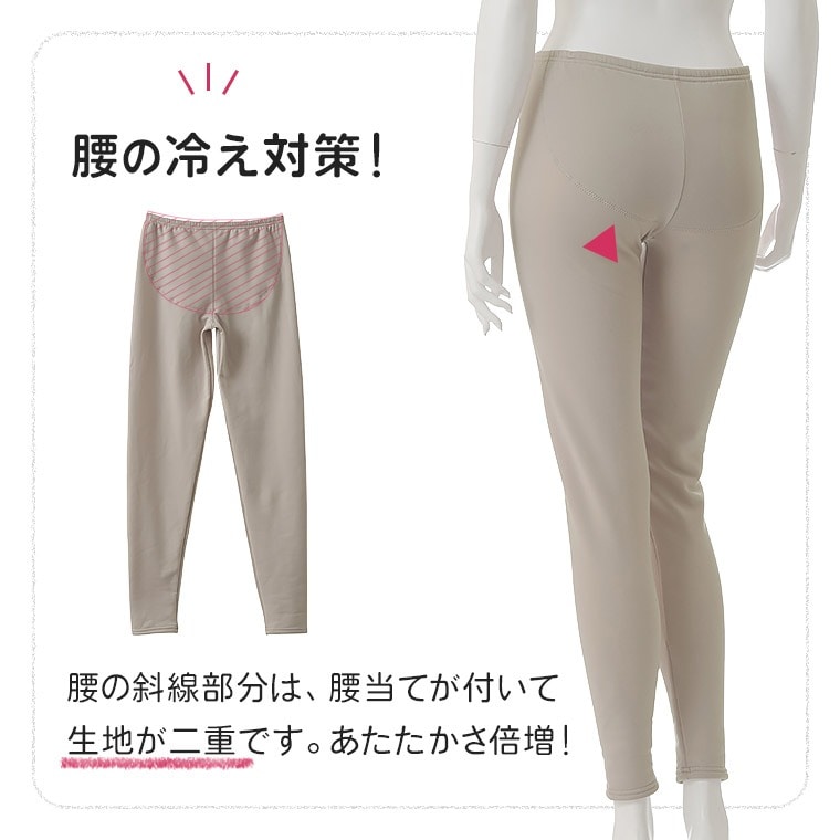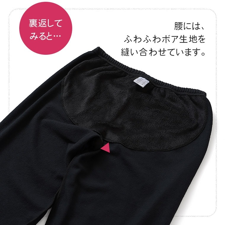 【スペック】 アイテム名:裏起毛ボア9分丈 P5825X-R サイズ M / L / LL ヒップ:87-95 / 92-100 / 97-105 着丈:90 / 93 / 96 身幅:36 / 39 / 42 ※サイズは生地により多少の差異があります。 素材:(本体)ポリエステル95%、ポリウレタン5% (貼り合わせ部分)ポリエステル97%、ポリウレタン3% 製造:中国 裏ボア 裏起毛 9分丈 あったか ズボン下 インナー レディース 秋冬 腰 冷え 対策 レギンス パンツ スパッツ 暖かい あたたかい 防寒 保温 腰 当て 付き 女性 婦人 下着 肌着 ストレッチ ベージュ/ピンク/ブラック M/L/LL P5825E-R