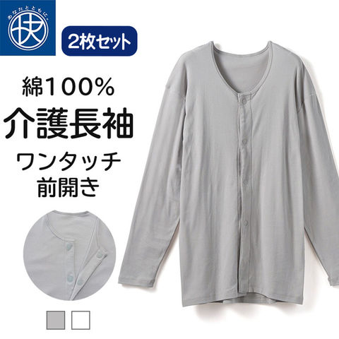 前開き 長袖シャツ 介護 綿100% メンズ 介護下着 介護ウェア ワンタッチ マジック テープ ボタン シニア 紳士 男性 抗菌防臭 肌着 介護用品 入院用 病院用 インナー こころよい ホワイト/グレー M/L/LL Q4050T-E