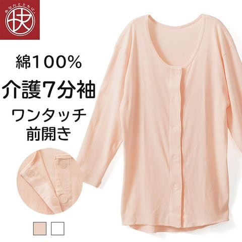 レディース インナー 前開き 7分袖シャツ 介護 綿100% 介護シャツ 介護ウェア ワンタッチ マジックテープ ボタン 抗菌防臭 シニア 婦人 女性 下着 肌着 介護用品 入院用 病院用 こころよい オフホワイト/ピンク M/L/LL Q5013T-E