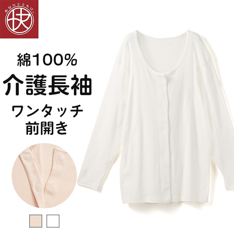 レディース インナー 前開き 長袖シャツ 介護 綿100% 介護用下着 ワンタッチ マジックテープ ボタン 抗菌防臭 シニア 婦人 女性 肌着 介護用品 入院用 病院用 こころよい ホワイト/ピンク M/L/LL Q9050T-E