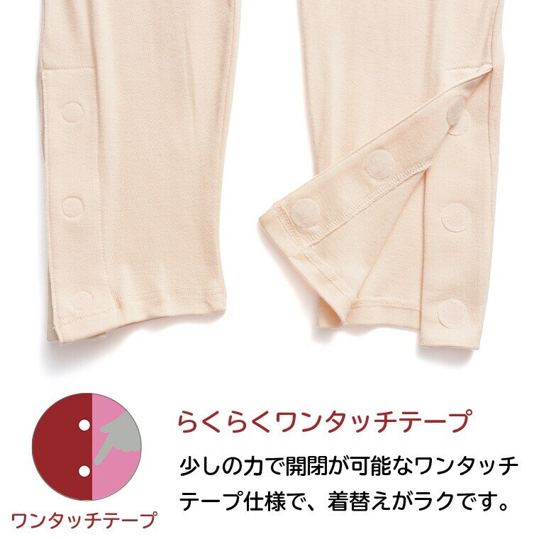 【スペック】 アイテム名: 快い インド綿膝下開きスラ下 Q9055T-E サイズ: M / L / LL ヒップ: 87-95 / 92-100 / 97-105 着丈: 88 / 91 / 94 身幅: 42 / 45 / 48 ※サイズは生地により多少の差異があります。 素材:(本体) 表:綿100% 中わた:ポリエステル100% 裏:綿100% 製造:中国 膝下ワンタッチ 9分丈ボトム 介護下着 綿100% レディース 介護ウェア 介護衣料 ワンタッチ マジックテープ ボタン 抗菌防臭 シニア 婦人 女性 肌着 インナー 介護用品 入院用 病院用 こころよい ホワイト/ピンク M/L/LL Q9055T-E