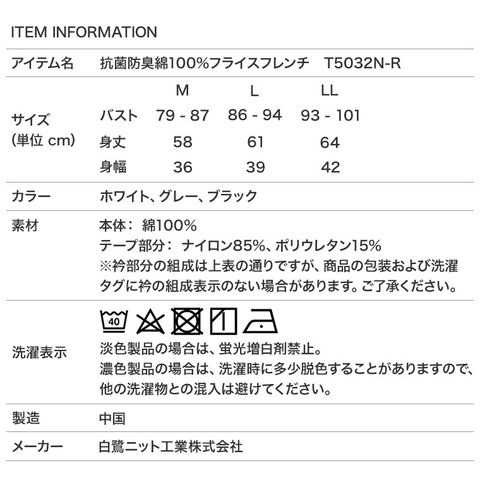 【スペック】 アイテム名: 抗菌防臭綿100%フライスキャミ T5032N-R サイズ: M / L / LL バスト:79-87 / 86-94 / 93-101 着丈: 58 / 61 / 64 身幅: 36 / 39 / 42 ※サイズは生地により多少の差異があります。 素材:(本体) 綿100% (テープ部分)ナイロン85%ポリウレタン15% ※衿部分の組成は上表の通りですが、商品の梱包および洗濯タグに衿の組成表示のない場合があります。 ご了承ください。 製造:中国 綿 100% インナー フレンチ袖 シンプル レディース 年間 コットン 100 抗菌 防臭 ベーシック 3分袖 半袖 ブラック/グレー/ホワイト M/L/LL T5032N-R