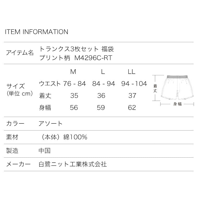 【スペック】 アイテム名:トランクス3枚セット 福袋 プリント柄 M4296C-RT サイズ M / L / LL / 3L / 4L / 5L ウエスト:76-84 / 84-94 / 94-104 / 104 - 114 / 114 - 124 / 124 - 134 着丈:35 / 36 / 37 / 38 / 39 / 40 身幅:56 / 59 / 62 / 65 / 68 / 71 ※サイズは生地により多少の差異があります。 素材:綿100% 製造:中国 お一人様3個まで トランクス セット 3枚組 福袋 メンズ 下着 年間 プリント柄 パンツ 前開き おしゃれ 綿100% アウトレット 男性 インナー M/L/LL/3L/4L/5L M4296C-RT 送料無料