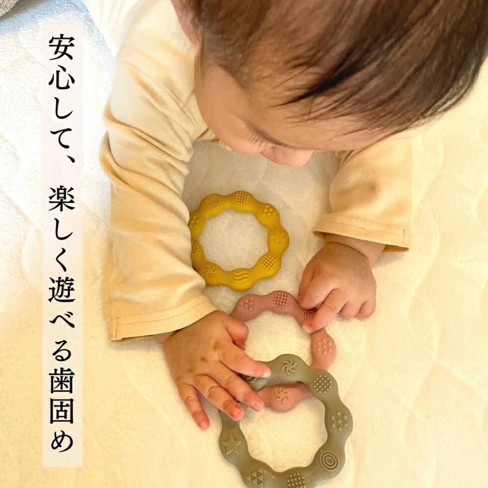 シリコン ドーナツティザー 海外の歯固めとかおしゃぶりです。カラーはピンク、セージ、イエローの3色。赤ちゃんの感覚を刺激しながら、歯茎の痛みやかゆみを和らげ、運動能力の発達も促しますと言われています。