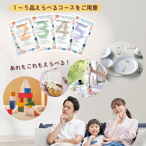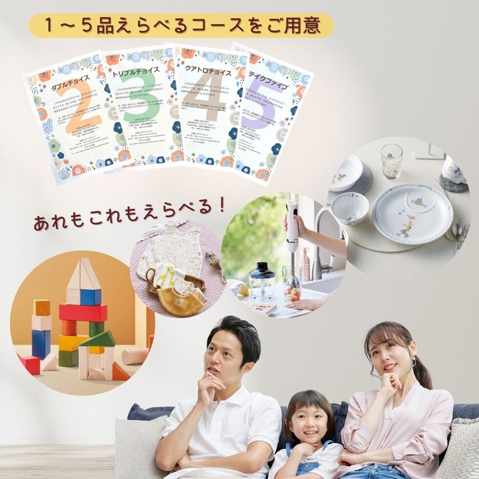 もらった方が1つ・2つ・3つ・4つ・5つの中から好きな商品を選べる、自由度の高いベビー専用カタログギフトです。
