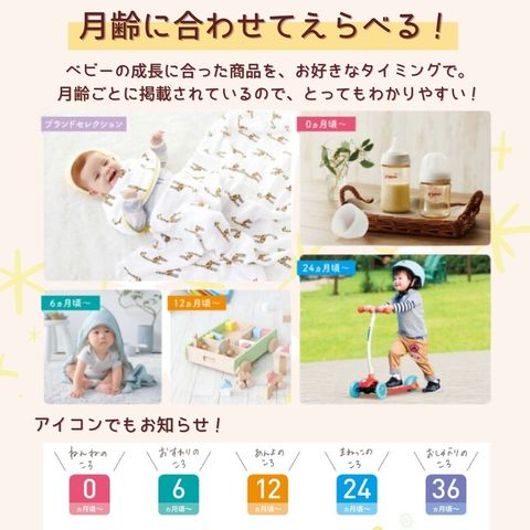 赤ちゃんの月齢に合わせて商品が掲載されているため、必要なものが直感的に探せます。