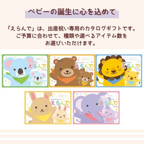 もらった方が1つ・2つ・3つ・4つ・5つの中から好きな商品を選べる、自由度の高いベビー専用カタログギフトです。