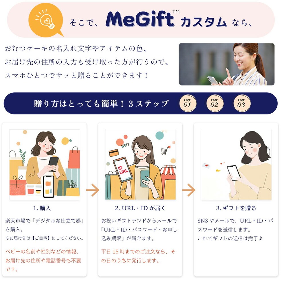 Me-Giftカスタムなら、贈る側はURLを送るだけ。 カスタマイズは受け取った方が行うので、失敗がありません。