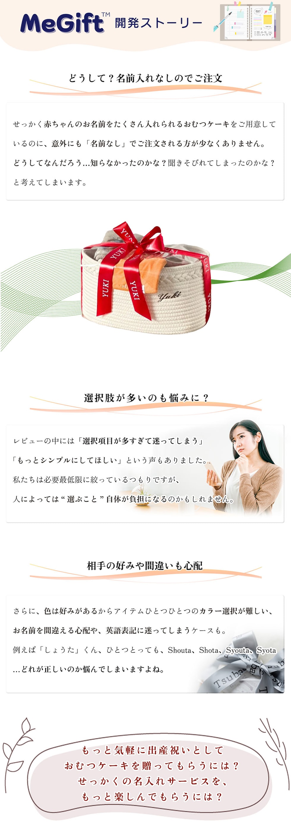 Me-Giftカスタムは、URL・ID・パスワードを送るだけで贈れる新しい出産祝い。 受け取った方が、自分の好みに合わせてカスタムできるおむつケーキです。