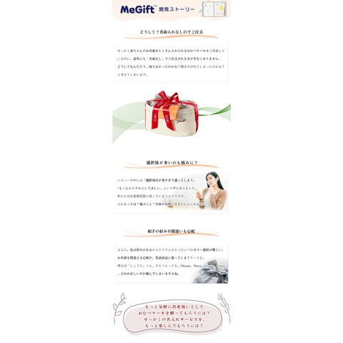 MeGift-customは、住所も聞かずに贈れる、新しい形の出産祝い。商品を購入すると、URL・ID・パスワード・有効期限が届き、それをSNSやメールで送るだけ。贈られた方がご自身で好きなデザインや仕様を選べます。