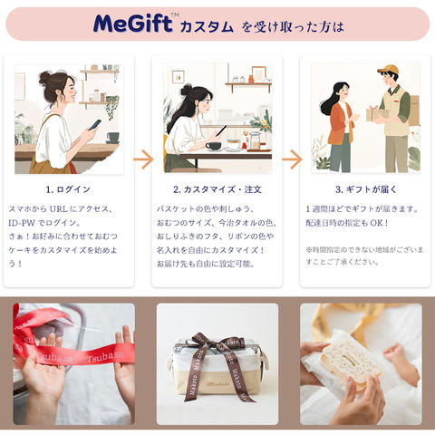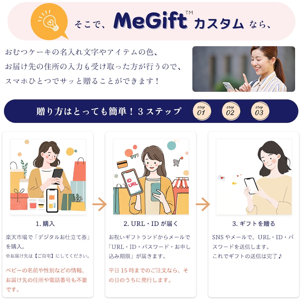 MeGift-customは、住所も聞かずに贈れる、新しい形の出産祝い。商品を購入すると、URL・ID・パスワード・有効期限が届き、それをSNSやメールで送るだけ。贈られた方がご自身で好きなデザインや仕様を選べます。