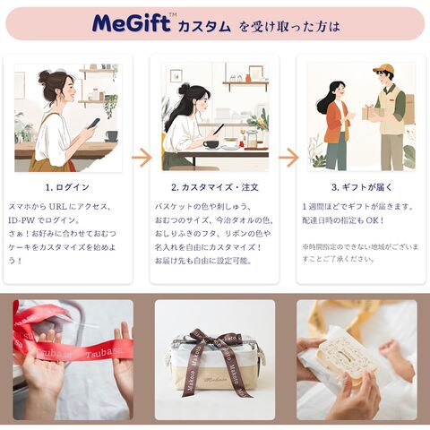 MeGift-customは、住所も聞かずに贈れる、新しい形の出産祝い。商品を購入すると、URL・ID・パスワード・有効期限が届き、それをSNSやメールで送るだけ。贈られた方がご自身で好きなデザインや仕様を選べます。