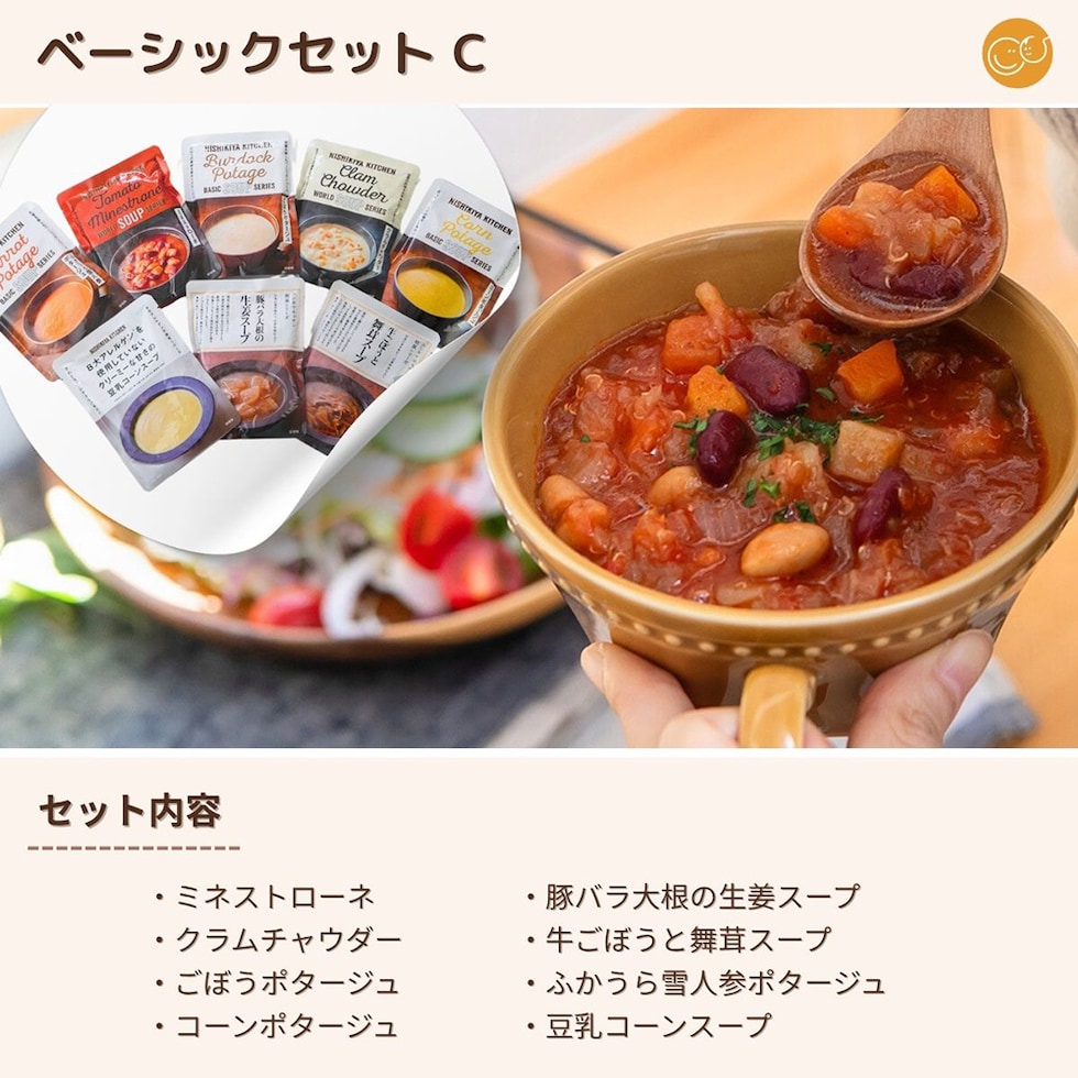 | 先様へのお届け商品 | ベーシックセットA : ビーフ・ポーク・チキン各1食 + デカフェ 5袋 、 ベーシックセットB : ビーフ3食 + デカフェ 5袋 、 (かっこ)内は食塩相当量 ベーシックセットC:( ミネストローネ180g ( 1.5g )、豚バラ大根の生姜スープ170g ( 1.5g )、クラムチャウダー180g ( 1.7g )、牛ごぼうと舞茸スープ170g ( 1.7g )、ごぼうポタージュ160g ( 0.7g )、ふかうら雪人参ポタージュ160g ( 0.7g )、コーンポタージュ160g ( 0.8g )、豆乳コーンスープ160g ( 1g ) )×1、合計:8食 ベビー & ご挨拶お祝いギフトランド 「オリジナルデカフェ15g」1袋 ベーシックセットD: ( タンシチュー180g ( 1.4g )、ミネストローネ180g ( 1.5g )、豚バラ大根の生姜スープ170g ( 1.5g )、クラムチャウダー180g ( 1.7g )、牛ごぼうと舞茸スープ170g ( 1.7g )、北海道産かぼちゃのチャウダー180g ( 0.9g ) )×1、合計:6食 ベビー & ご挨拶お祝いギフトランド 「オリジナルデカフェ15g」1袋 ベビー & ご挨拶お祝いギフトランド 「オリジナルデカフェ15g」1袋 ディップスタイルのデカフェです。お湯の中にコーヒーバッグをつけておくだけで簡単に美味しいデカフェが楽しめます。※ 本製品の仕様・セット内容等、予告なく変更すること がございますの であらかじめご了承ください。 |
