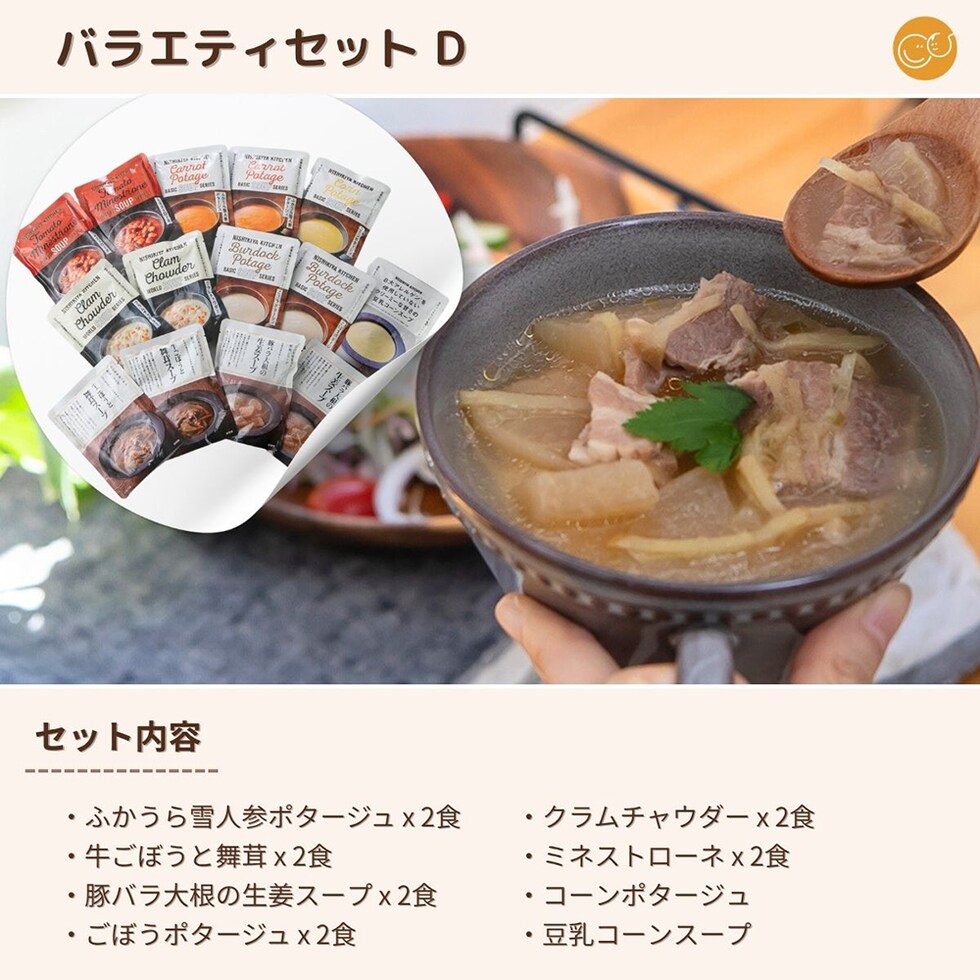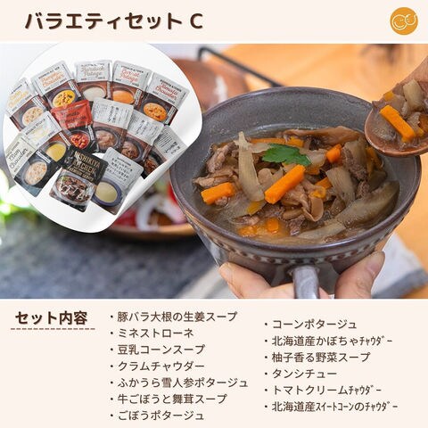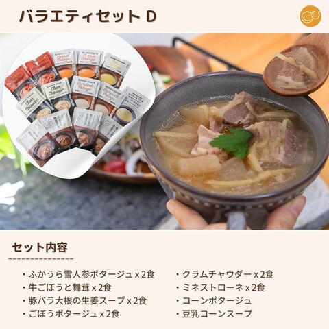 | 先様へのお届け商品 | バラエティーセットA : ビーフ・ポーク各3食、チキン2食 + デカフェ 6袋 、 バラエティーセットB : ビーフ・ポーク各4食 + デカフェ 6袋 、(かっこ)内は食塩相当量 バラエティーセットC: ( タンシチュー180g ( 1.4g )、ミネストローネ180g ( 1.5g )、豚バラ大根の生姜スープ170g ( 1.5g )、クラムチャウダー180g ( 1.7g )、牛ごぼうと舞茸スープ170g ( 1.7g )、北海道産かぼちゃのチャウダー180g ( 0.9g )、北海道産スイートコーンのチャウダー180g ( 1g )、柚子香る野菜スープ170g ( 1.6g )、国産トマトクリームチャウダー180g ( 1.7g )、ごぼうポタージュ160g ( 0.7g )、ふかうら雪人参ポタージュ160g ( 0.7g )、コーンポタージュ160g ( 0.8g )、豆乳コーンスープ160g ( 1g ))×1、 合計:13食 ベビー & ご挨拶お祝いギフトランド 「オリジナルデカフェ15g」1袋 バラエティーセットD: ( ミネストローネ180g ( 1.5g )、豚バラ大根の生姜スープ170g ( 1.5g )、クラムチャウダー180g ( 1.7g )、牛ごぼうと舞茸スープ170g ( 1.7g )、ごぼうポタージュ160g ( 0.7g )、ふかうら雪人参ポタージュ160g ( 0.7g ))×2、(コーンポタージュ160g ( 0.8g )、豆乳コーンスープ160g ( 1g ))×1、合計:14食 ベビー & ご挨拶お祝いギフトランド 「オリジナルデカフェ15g」1袋 ※ 本製品の仕様・セット内容等、予告なく変更すること がございますの であらかじめご了承ください。 |