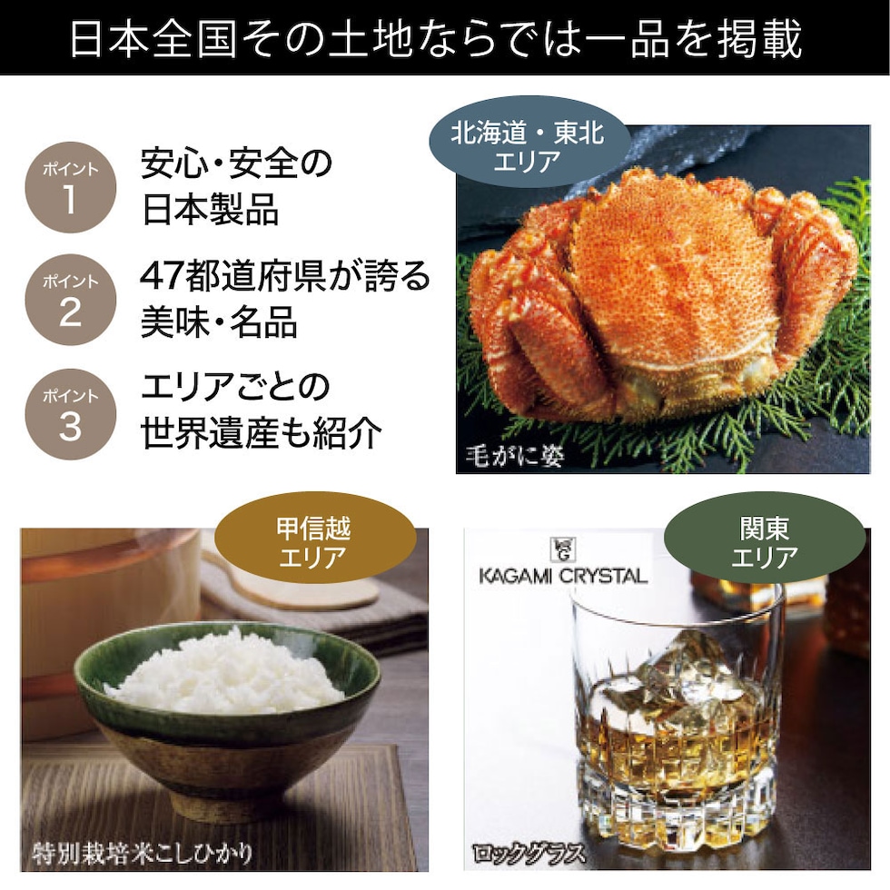 日本全国47都道府県から、土地の魅力が詰まった「美味・名品」を厳選。 豊かな自然と風土に育まれ、職人の技と知恵が息づく、 その土地ならではの一品を集めたカタログギフトです。