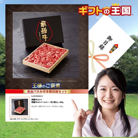 | 商品内容 | 飛騨牛 A3?A4等級 切り落とし300g / 景品引換券(引換ハガキ) / A4パネル |