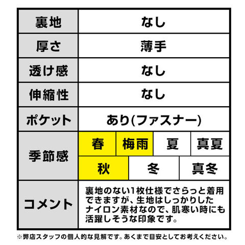 コメント:裏地のない1枚仕様でさらっと着用できますが、生地はしっかりしたナイロン素材なので、肌寒い時にも活躍しそうな印象です。