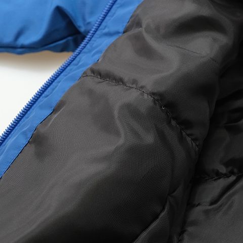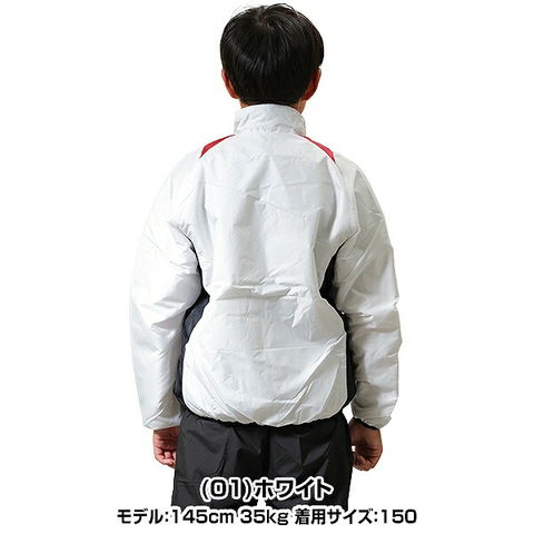 ジュニアグラウンドコートバックウオームシステム搭載の肩と脇の切替が特徴のジュニアグラウンドコート●素材:身頃:ミニリップ(ポリエステル100%)、切替:3Dリップ(ポリエステル100%)、中:中わた(ポリエステル100%)、裏:エステルタフタ×蓄熱起毛(衿裏)(ポリエステル100%)